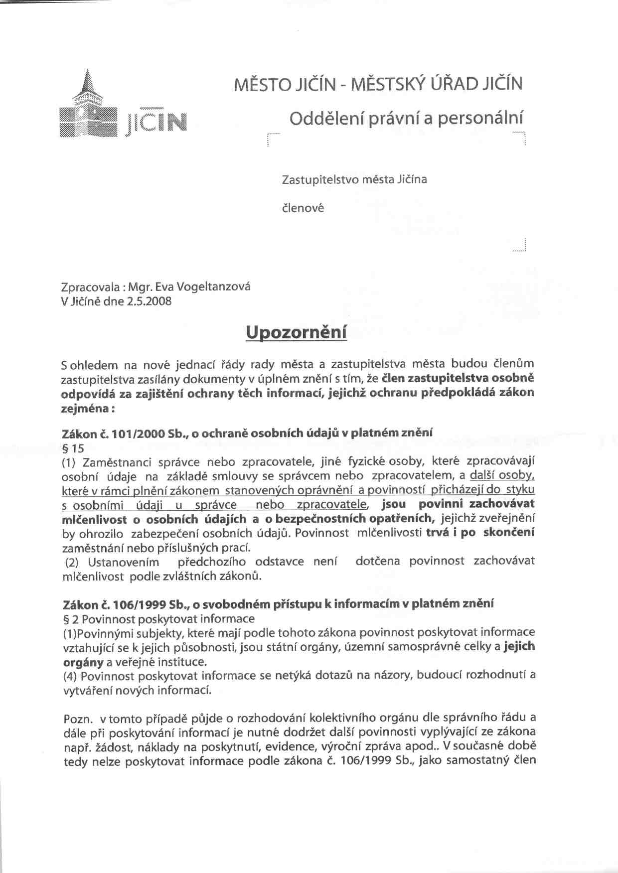Upozornění zastupitelům od právního oddělení města, které se snaží zoufale zabránit tomu, aby se občané po změně jednacího řádu (čili jeho uvedení do souladu se zákonem po mnoha letech) mohli kvalifikovaně připravit na zasedání zastupitelstva k projednávaným věcem, viz konec str. 1 a začátek str. 2. |