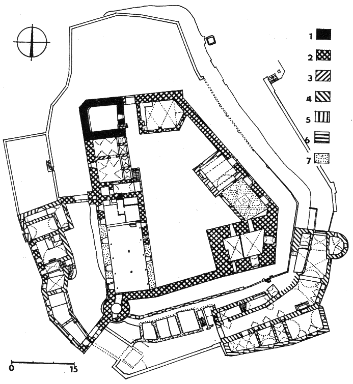 Kost. Plán hradu (podle D. Menclové, upraveno). 1 – zdivo z prvé poloviny 14. století, 2 – zdivo z poslední třetiny 14. století, 3 – zdivo z přelomu 15. a 16. století, 4 – zdivo z poloviny16. století, 5, 6 – mladší renesanční zdivo, 7 – zdivo z doby po třicetileté válce Ilustrovaná Encyklopedie českých hradů, Tomáš Durdík, LIBRI 1999