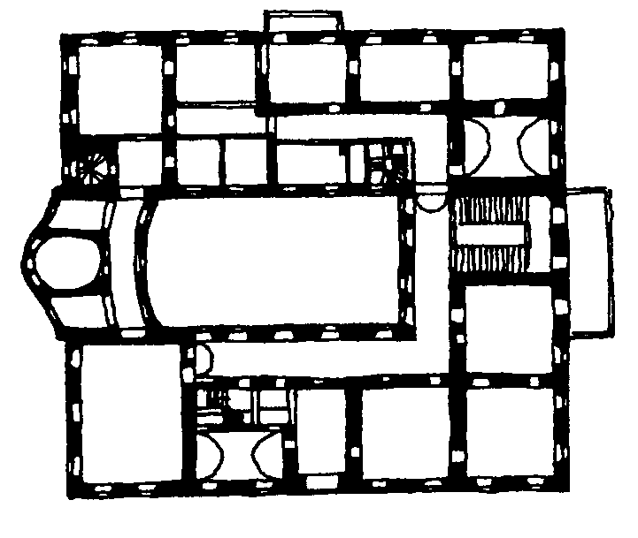 | Půdorys prvního patra zámku v Lázních Bělohrad ukazuje velkou rozdílnost v řešení uzavírajícího křídla s oválnou kaplí a ostatních částí zámku s pravidelnou, v některých místech čtvercovou dispozicí místností. Ty prozrazují renesanční původ, na rozdíl od dynamicky pojaté vstupní partie s konkávkonvexním vykrojením, která vznikla kolem roku 1720 patrně za účasti Jana Blažeje Santiniho-Aichla. |