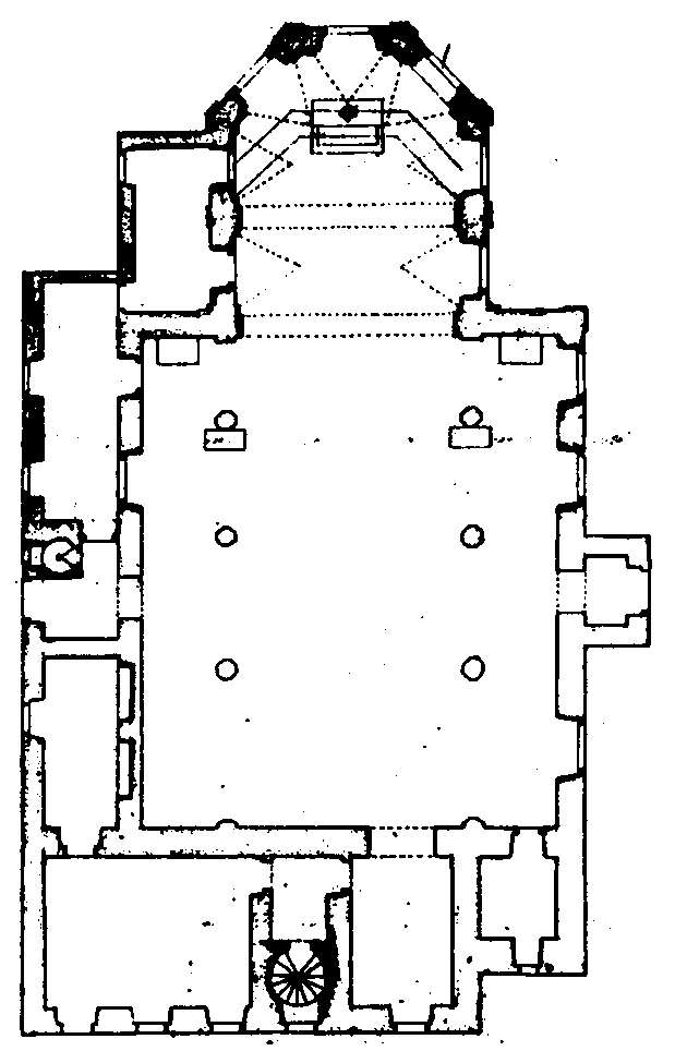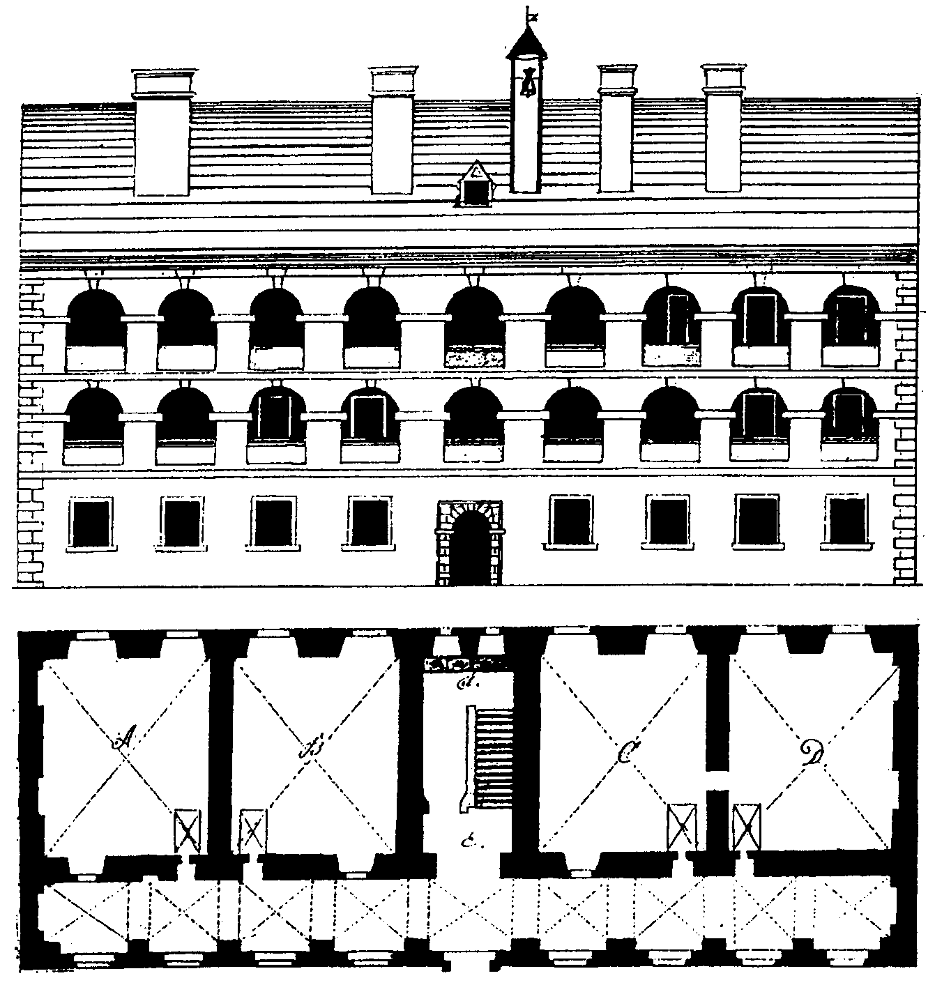 Půdorys a nákres fasády jesuitského gymnasia v Jičíně, kresba podle historických plánů.