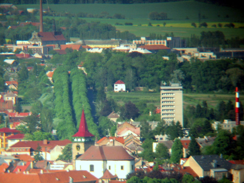 Tato ne zcela kvalitní fotografie jasně ukazuje hlavní osu Valdštejnské krajinné kompozice: Velíš – Valdická brána – lipové stromořadí – klášter Valdice. Fotografie byla pořízena z Velíše. V popředí výrazně vystupuje kostel sv. Jakuba Většího, za ním známá Valdická brána. Linie dál pokračuje čtyřřadým lipovým stromořadím (po brutálním ořezu v l. 1994–96), prochází Loggií a protíná pozemky kláštera kartuziánů ve Valdicích. Linie dále těsně míjí Kumburk.