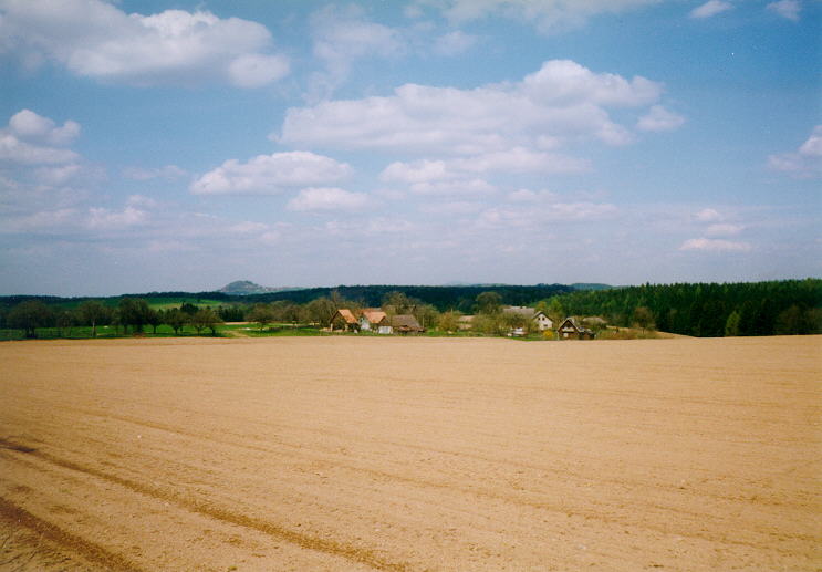 Vyskeř (466 m.n.m.; 17 km SZ od Jičína) je jedním z vrchů Českého ráje známých pro svou nezaměnitelnou siluetu. Na obrázku není sice příliš patrný, ale jeho tvar je zřetelný. V popředí na obrázku je osada Pařízek. Na Vyskři se nachází kaplička. |