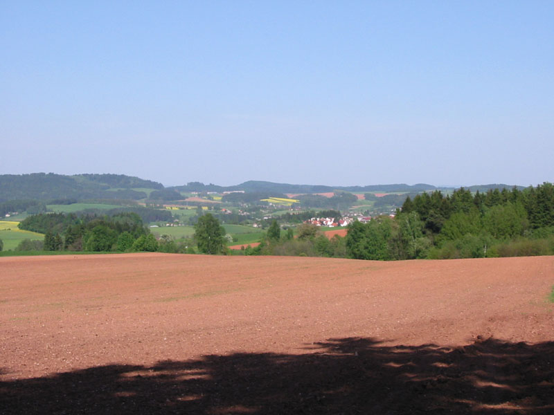 | Typická podkronošská krajina nad Novou Pakou při pohledu od Brda. Pěkný kontrast načervenalé půdy a žlutě kvetoucích řepkových polí se zelení trávy a lesů. Vpravo od středu obrázku vykukuje Nová Paka. |
