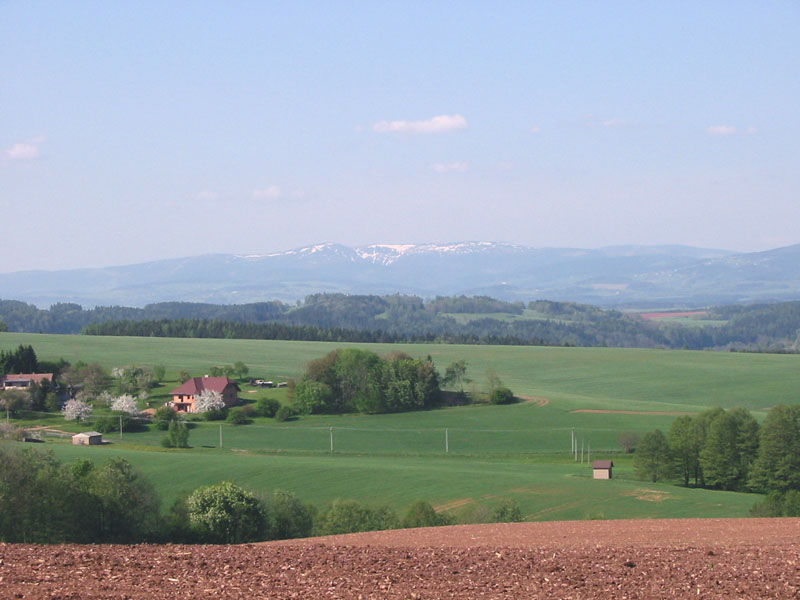 Hřebeny Krkonoš (1100–1300 m.n.m.) s dosud neroztátým sněhem při pohledu od Brda z nadmořské výšky kolem 520 m.