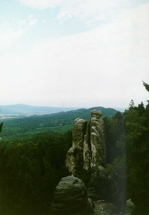 ![]() 2. Jedno z nejkrásnějších panoramat Prachovských skal. Vyhlídka na Prachovskou jehlu a Prachovskou Čapku, v pozadí Trosky a v dalekém obzoru Ještěd. 26K / 63K říjen 1998 |