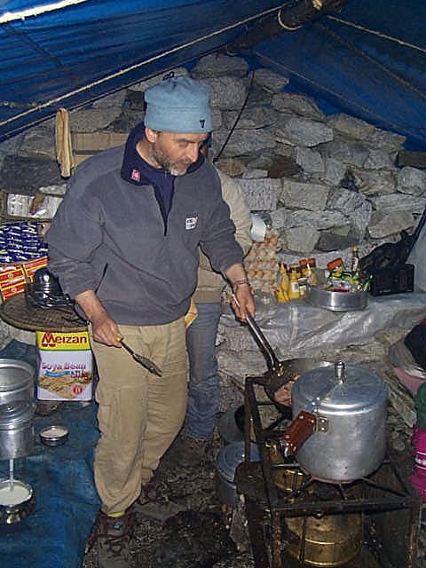 Dorazili jsme do předpokládané výše C3 cca 7200m a bezradně jsme se rozhlíželi kolem. Pouze iluzorní krytí jakéhokoliv stanu postaveného v těchto místech bylo evidentní. Představa několika nocí strávených zde, pod přímou palbou kamenů z horní části stěny, vzbuzovala silný pocit ruské rulety. Nicméně tyto starosti byly okamžitě zatlačeny přízemnějšími a aktuálnějšími. Vykopat ve tvrdém sklovitém ledu plošinu pro stan našimi nástroji, tj. cepíny by byl úkol pro soudruha Sisyfa i za předpokladu, že brzy nenarazíme na skalní podklad. Následující zmatené pobíhání nahoru a dolů stěnou přece jen přineslo výsledek v podobě částečně krytého místa, kde jsme byli schopni vytvořit plošinu pro stan. Toto vítězství ducha nad hmotou je velkou zásluhou Pepína Morávka a jeho nezdolné víry v lepší příští.