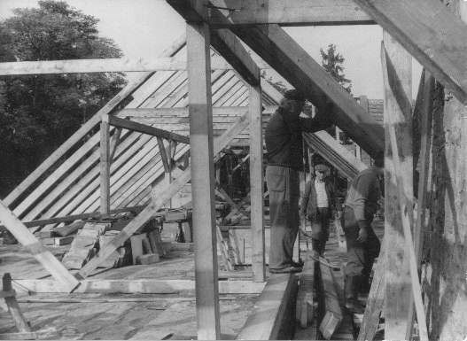 V říjnu jsme se dočkali konečně vazby na gotice, provedl ji i s laťováním za naší pomoci tři tesaři z Valdic. Pak klempíři z Rožďalovic udělali úžlabí, okapy i odpady a hned došlo i na pokrytí střechy taškami, což provedli Josef Škoda ze Psinic se svým synem Janem. A tak letos dochází k zastřešení gotické části zámku, o čemž jsme po léta snili. Museli jsme zde léta usilovně pracovat, ale nemožné se tak stává skutečností.