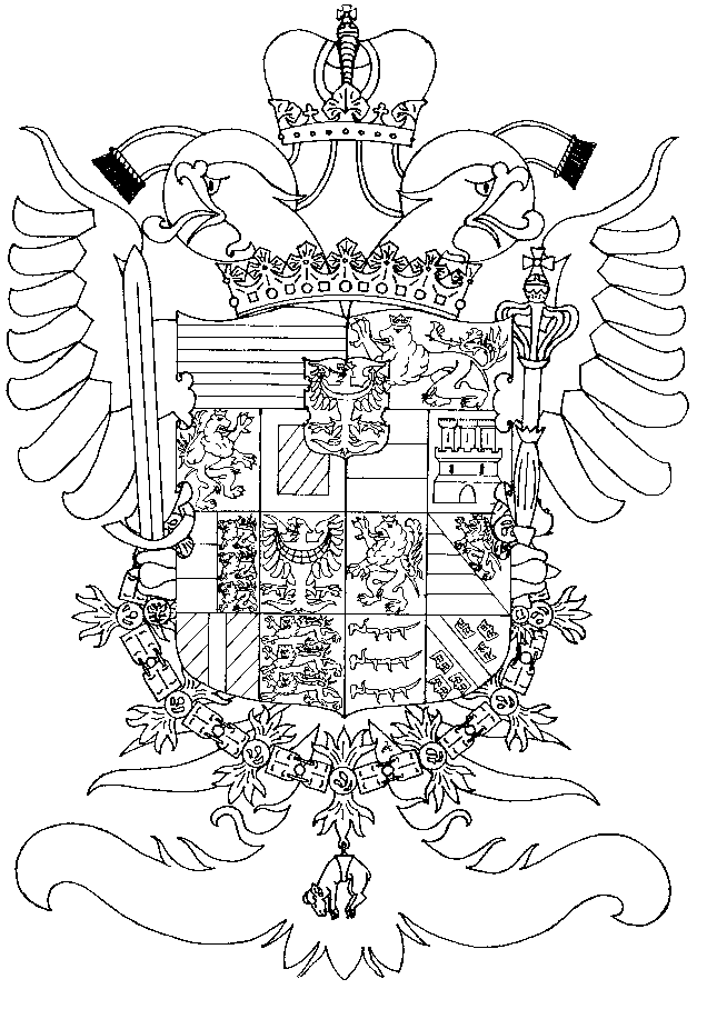 Erb: štít třikrát dělený, jednou polcený a pod prvními dvěma poli v hlavě štítu polcen celkem třikrát. Čestný štítek, stříbrný s červenou korunovanou orlicí se zlatým perizoniem (Tyroly). 1. 7x stříbrno-červeně děleno (Uhry), 2. v červeném stříbrný, korunovaný, dvouocasý lev (Čechy), 3. ve stříbře červený, korunovaný, vlevo hledící lev (Leon), 4. 7x modro-zlatě šikmo polceno s červenou bordurou (Burgundy), 5. v červeném střibrné břevno (Rakousko), 6. v červeném zlatý hrad (Kastilie), 7. děleno, vpravo v červeném střibrné břevno, v levém ve zlatě tři černí lvi (Korutany), 8. ve stříbře modré orlice s červeno-stříbrně šachovaným perizoniem (Kraňsko), 9. ve zlatě červený, modře korunovaný lev (Habsburg), 10. kosmo děleno, vpravo ve stříbře dvě červená břevna, vlevo v modrém zlatý korunovaný lev (Gorice), 11. 7x šikmo červeno-stříbrně děleno, přes vše zlatý kůl (Burgau), 12. ve zlatě tři černí levharti (Švábsko), 13. ve zlatě pod sebou tři černé parohy (Würtenberg), 14. v červeném zlaté kosmé břevno, doprovázené třemi zlatými korunami po obou stranách (1, 2 a 2, 1). Štít je položen na prsou černého orla s císařskou korunou. Štít je korunován sedmilistou korunou a ovinut řádem zlatého rouna. V pravém spáru drží orel meč, v levém žezlo.J. Hrdlička – M. Fiala