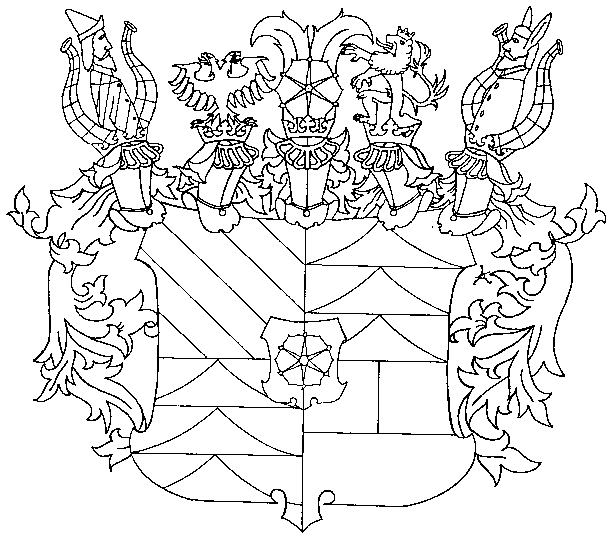 Erb: Čtvrcený štít se srdečním štítkem. Štítek červenostříbrně polcen se šestilistou růží střídavých barev se zlatým semeníkem. I pětkrát stříbrně a červeně kosmo děleno. 2. a 3. stříbrné se třemi červenými klíny pod sebou. 4. děleno, nahoře červenostříbrně polceno, dole zlaté. Na štítě pět příleb s klenotem. I. dva červenostříbrné šachované rohy, mezi nimi pětkrát červeně a stříbrně šikmo dělený rostoucí muž s červeným kloboukem. Přikrývadla červenostříbrná, II. černý orel. Přikrývadla červenostříbrná. III. dvě pera, pravé červené, levé střibrné, na nich růže ze štítu. Přikrývadla červenostříbrná, červenozlatá. IV. stříbrný korunovaný lev. Přikrývadla červenozlatá. V. dva červenostříbrně šachované rohy, mezi nimi stříbrně oděný bezruký muž s oslíma ušima. Přikrývadla červenozlatá.M. Fiala – J. Hrdlička