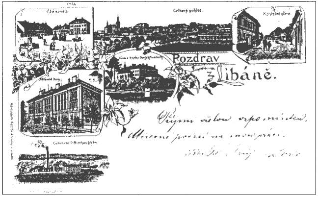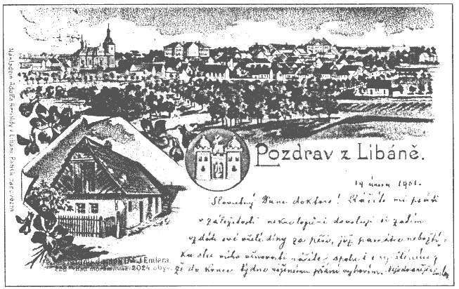 Přinášíme dnes reprodukce dvou stoletých pohlednic Libáně a okolí. Obě vydal pan Adolf Arnoldy z Libáně někdy na přelomu století, přesnou dobu vzniku nevíme. První je uložena ve sbírkách LA PNP a odeslal ji 19. února 1901 Jan Emler profesoru Čeňku Zíbrtovi (za upozornění děkujeme dr. Miloši Sládkovi). Je na ní pohled na Libáň s textem Pozdrav z Libáně; připojeno je zobrazení městského znaku a pohled na původní podobu rodného domu prof. Josefa Emlera. Z dalších otištěných údajů se dovídáme, že Libáň leží 228 metrů nad mořem a žije zde 2024 obyvatel.