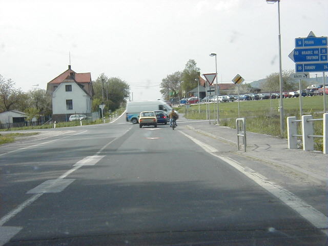Pohled od Jičína ze vzdálenosti přibl. 60 m před křižovatkou z odstavné plochy. Zde jsou patrná dvě blikající světélka (právě svítí to levé), dále zašlé vodorovné značení, částečně též 3 trojúhelníky na zemi, které byly domalovány druhý den po zatím poslední nehodě s těžkým zraněním (18/04/2000) a zábradlí po pravé straně, které zabraňuje cyklistům ve vjetí do silnice. Na fotografii totiž není vidět další rarita – podjezd pro cyklisty, kterým od Holína přijedete vpravo právě do zábradlí a pokud jedete do Jičína (jinam ani nemá smysl jet), pak se ocitáte u blikajícího světélka náhle v protisměru. Větší tmavé vozidlo právě odbočuje vpravo na silnici třetí třídy vedoucí do Holína a na Prachov (hlavní turistická trasa).