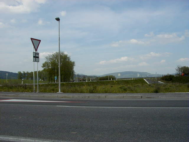Snímek pořízený ze stojícího vozidla přes silnici z Jičína směrem k turnovské silnici dokumentuje výškový rozdíl obou vozovek.