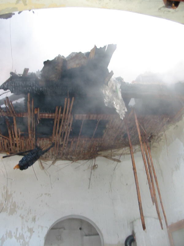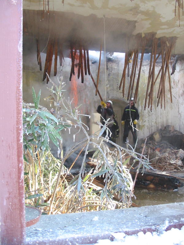 Restituovaný zámek v Mladějově počal hořet v noci ze 2. na 3. ledna 2002. Požár byl na HZS Jičín nahlášen kolem 01.30, dle svědků jej zjistila sama p. Gabriela Hamacherová, kterou vzbudil pes. Vzhledem k lokalitě zámku byl zprvu pro hasičskou techniku přístup poněkud obtížný (zámek se nachází v obci na návrší), a proto musela Okresní správa a údržba silnic pomoci a upravit příjezdové trasy. Aktivní hašení trvalo do dopoledních hodin, i poté však zámek doutnal a stropní konstrukce pomalu hořely až do večera. Při požáru zasahovaly tři profesionální jednotky z Jičína, Hořic, Hradce Králové a členové dobrovolných sborů z Mladějova, Sobotky, Markvartic, Hubojed a Rovně. Na zámku bylo pozorovatelné statické poškození, kdy patrně vlivem tepelné expanze začaly působit tlakové síly střešní konstrukce a na obou rozích zámku směřujících k obci se objevily trhliny. Vzhledem k důkladnému nasáknutí hasební vodou a mrazům, které v těchto dnech dosahují až k -20°C, existují obavy, že zámek bude staticky natolik poškozen, že není vyloučeno ani jeho stržení.