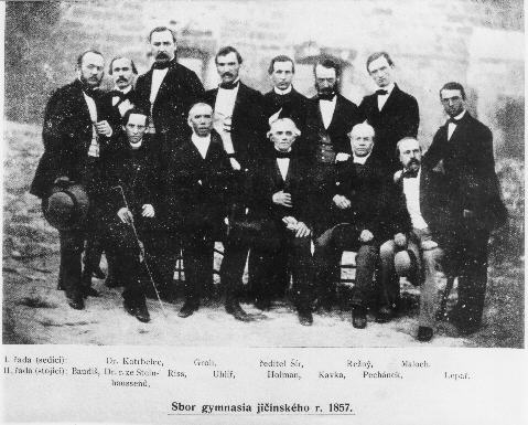 I. řada (sedící): Dr. Kotrbelec, Groh, ředitel Šír, Režný, Maloch. II. řada (stojící): Baudiš, Dr. r. ze Steinhausenů, Riss, Uhlíř, Holman, Kavka, Pechánek, Lepař