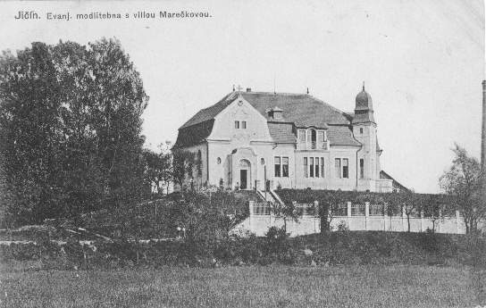 Bohuslav Mareček byl jedním z úspěšných jičínských podnikatelů na počátku minulého století. Pocházel z rodiny evangelického faráře od Přelouče, a jak to u protestantů bývá (praktický úspěch je prý znamením Boží milosti a znamením předurčení ke spáse), byl to podnikatel někdy tvrdý, ale vždy solidní a čestný. V roce 1888-89 postavil (tehdy ještě s p. Němečkem) moderní kruhovou cihelnu nedaleko sv. Václava a v letech 1902-3 přistavěl k cihelně parní mlýn. Když komplex doplnil secesní vilou (1907-8), postavil u ní současně evangelickou modlitebnu, na kterou ovšem přispěli i jiní. Její vysvěcení na sv. Václava 28.9.1908 bylo sotva náhodné. O tomto svátku totiž chodíval průvod katolíků v čele s panem děkanem od kostela sv. Jakuba k ozdobené soše světce a u ní se odbývala pobožnost.