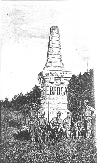 Sloup na rozhraní Asie a Evropy v Uržumce, 18 km východně od Zlatoustu, s naší rozvědkou.