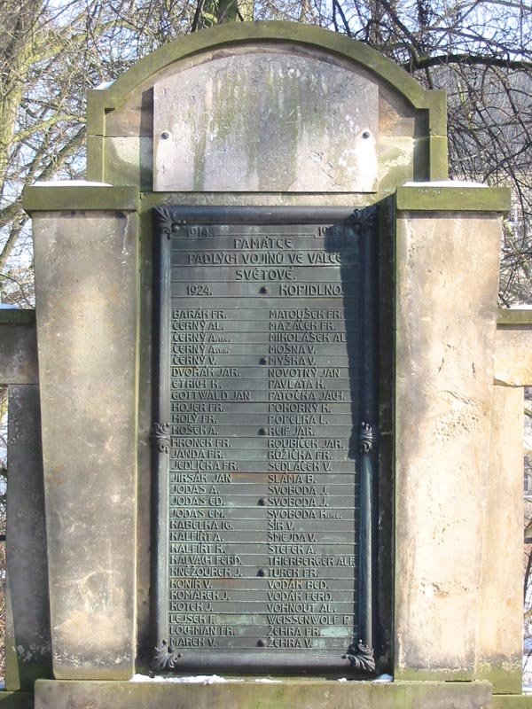 Pomník je koncipován jako centrální s litinovou deskou (autor Josef Šidlikovský, zvonárna Lomnice nad Popelkou) a s deskou obětem 2. sv. války v horní části (viz 202). Autorem návrhu je architekt Vilém Kvasnička. |