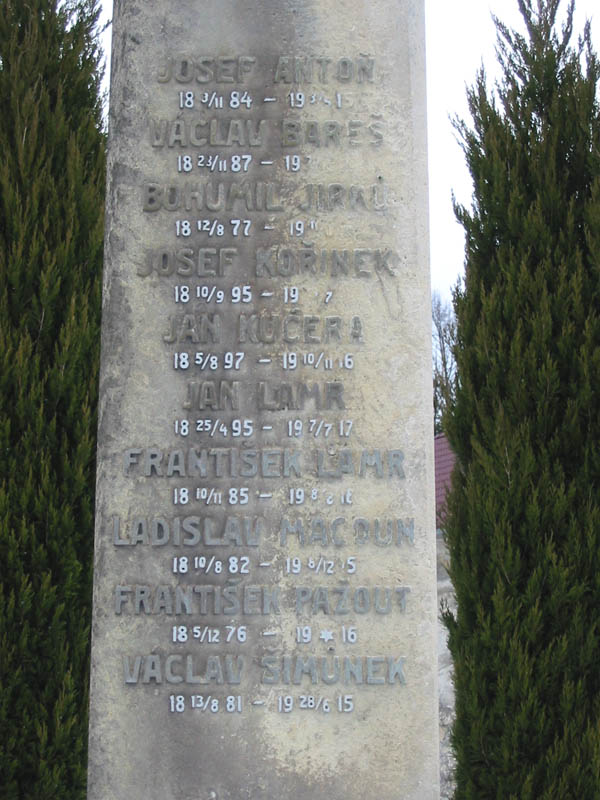 Josef Antoň 3/11 1884 – 3/5 1915 Václav Bareš 23/11 1887 – xx/xx 19xx Bohumil Jirků 12/8 1877 – 11/xx 19xx Josef Kořínek 10/9 1895 – 10/7 1918 (??) Jan Kučera 5/8 1897 – 10/11 1916 Jan Lamr 25/4 1895 – 7/7 1917 František Lamr 10/11 1885 – 8/8 1918 Ladislav Macoun 10/8 1882 – 8/12 1915 František Pažout 5/12 1876 – 1916 Václav Šimůnek 13/8 1881 – 28/6 1915 |