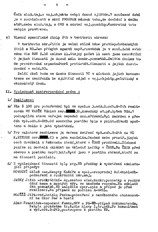 V teritoriu okr. Jičín je velmi silná báze protispolečenských živlů a NO. Jen přímých agentů nepř. rozvědek je v souč. době evidováno dle RMV č. 10 celkem 11. Stejný počet 11 osob jsou navrátilci. O jejich činnosti je dosud málo konkr. poznatků. Dalším úkolem bude prověřování organizátorů protistát. činnosti a jejich doevidování v evid. NO.