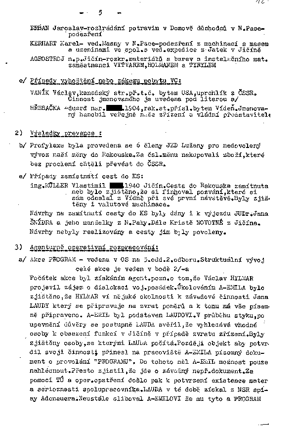 Počátek akce byl získáním agent. pozn. o tom, že Václav HYLMAR projevil zájem o dislokaci voj. posádek. Úkolováním A-EMILA05 bylo zjištěno, že HYLMAR ví nějaké okolnosti k závadové činnosti Jana LAUDY který se připravuje na zvrat poměrů a k tomu má vše písemně připraveno. A-EMIL byl podstaven LAUDOVI. V průběhu styku, po upevnění důvěry se postupně LAUDA svěřil, že vyhledává vhodné osoby k obsazení funkcí v Jičíně v případě zvratu zřízení. Byly zjištěny osoby, se kterými LAUDA počítá. Později objekt aby potvrdil svoji činnosti přinesl na parkoviště A-EMILA písemný dokument o provolání "PROGRAMU". Do toho měl A-EMIL možnost pouze nahlédnout. Přesto zjistil, že jde o závažný nepř. dokument. Za pomoci TÚ a oper. opatření došlo pak k potvrzení existence mater. a serioznosti spolupracovníka. LAUDA v té době získal z NSR spisy Adenauera. Neustále sliboval A-EMILOVI že mu tyto a PROGRAM