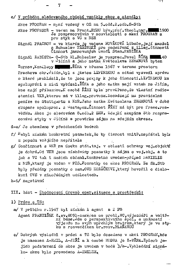Signál RADISTA04 - O-Stb Ml. Boleslav je rozprac. Pavel ŘÍHA XXXXX. 40 v Jičíně a jeho matka Květoslava ZEMANOVÁ bytem Turnov, Konělupy XXXXX. ŘÍHA v březnu 1967 v terenu prostoru Prachova okr. Jičín, byl s jistou LIPINSKOU a odtud vyzvedl zprávu o které prohlásil, že to jsou pokyny k jeho činnosti. LIPINSKOU ke spolupráci s nimi vybízel. ŘÍHA a jeho matka mají vztah na Jičín, kde mají příbuznou. K osobě ŘÍHY bylo prověřeno, že vlastní radiostanici VKR, kterou má v illeg. provozu. Docházejí mu pravidelně peníze ze Stuttgartu z NSR. Jeho matka Květoslava ZEMANOVÁ v době okupace spoluprac. s Gestapem. Činnost ŘÍHY má být pro franc. rozvědku. Akce je sledována 8. odb. 2 SMV. Zdejší skupina Stb rozpracovává styky v Jičíně a prověrku zájmu na zdejším okrese.