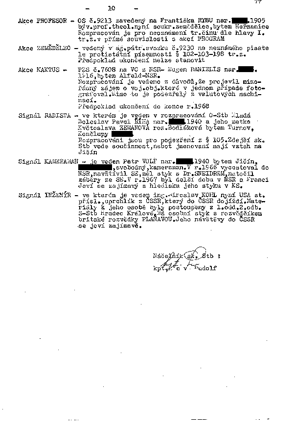 Signál INŽENÝR08 - ve kterém je veden ing. Miroslav KOHL nyní USA st. přísl., uprchlík z ČSSR, který do ČSSR dojíždí. Materiály k jeho osobě byly postoupeny z 1. odd. 2. odb. S-Stb Hradec Králové. Má osobní styk s rozvědčíkem britské rozvědky PLAŇAVOU. Jeho návštěvy do ČSSR se jeví zajímavě.