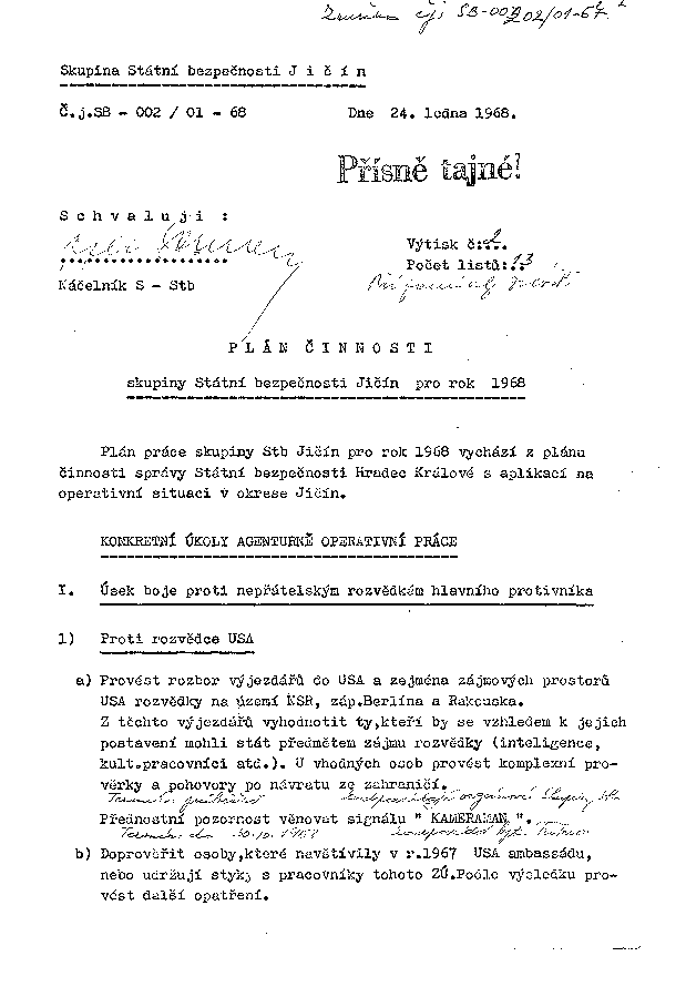 Plán činnosti skupiny Státní bezpečnosti Jičín pro rok 1968