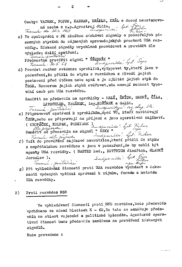 f) Vzít do prověření zajímavé navrátilce, kteří přišli do styku s nepřátelskou rozvědkou a jsou v podezření, že by mohli být agenty USA rozvědky. (BARTKO07 Lad., DITTRICH08 Jindřich, HLADKÝ09 Jaroslav).