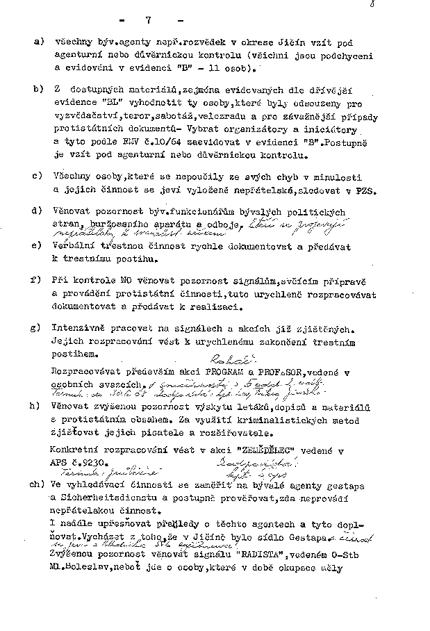 a) všechny býv.agenty nepř.rozvědek v okrese Jičín vzít pod agenturní nebo důvěrnickou kontrolu (všichni jsou podchyceni a evidování v evidenci "B" - 11 osob).