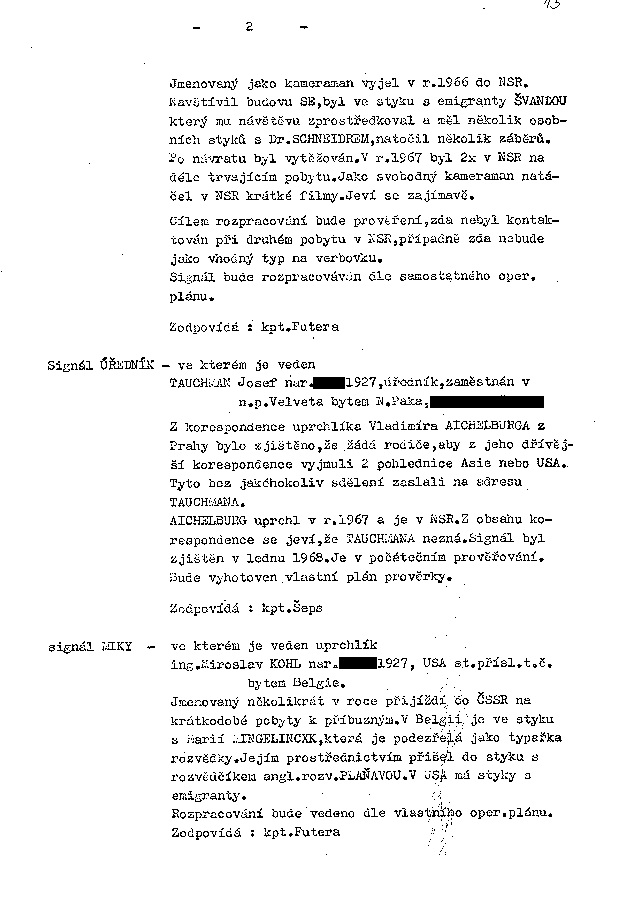 AICHELBURG uprchl v r.1967 a je v NSR. Z obsahu korespondence se jeví, že TAUCHMANA nezná. Signál byl zjištěn v lednu 1968. Je v počátečním prověřování. Bude vyhotoven vlastní plán prověrky.