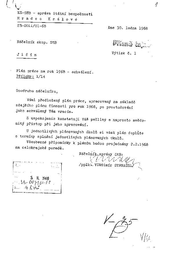 Vámi předložený plán práce, zpracovaný na základě zdejšího plánu činnosti pro rok 1968, po prostudování jako schválený Vám vracím.