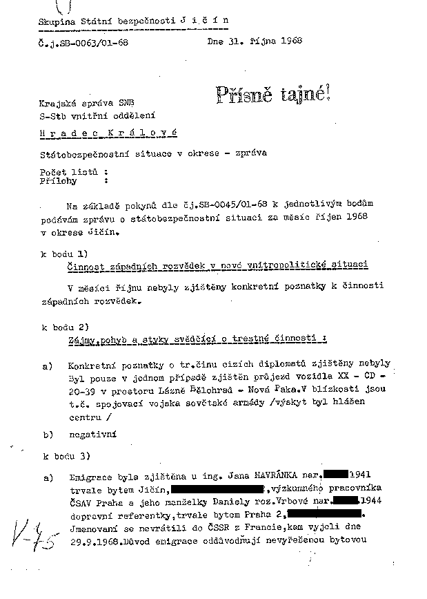 a) Emigrace byla zjištěna u ing. Jana HAVRÁNKA nar. XXXX.1941 trvale bytem Jičín, XXXXXXXXXXXXXXXXXX, výzkumného pracovníka ČSAV Praha a jeho manželky Daniely roz. Vrbové nar. XXXX.1944 dopravní referentky, trvale bytem Praha 2, XXXXXXXXXXXXXX. Jmenovaní se nevrátili do ČSSR z Francie, kam vyjeli dne 29.9.1968. Důvod emigrace oddůvodňují nevyřešenou bytovou