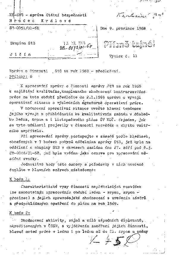K zpracování zprávy o činnosti správy StB za rok 1968 k zajištění kvalitního, komplexního zhodnocení kontrarozvědné práce za toto období předložte do 2.1.1969 zprávu o vývoji operativní situace a výsledcích agenturně operativní práce.