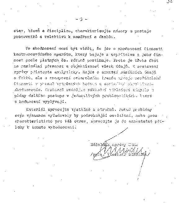Ve zhodnocení musí být vidět, že jde o zhodnocení činnosti kontrarozvědného aparátu, který bojuje s nepřítelem a jeho činnost podle platných čs. zákonů postihuje. Proto je třeba dbát na maximální přesnost a objektivnost všech údajů. K sestavení zprávy přistupte analyticky. Nejde o shrnutí měsíčních údajů a faktů, ale o zachycení celoročního trendu vývoje nepřátelské činnosti v přesně vytyčených bodech a s [agenturně] [operativním] zhodnocením. Současně uvádějte základní výhledové [xxxyxxy] a plány dalšího postupu v jednotlivých problematikách, které z hodnocení vyplývají.
