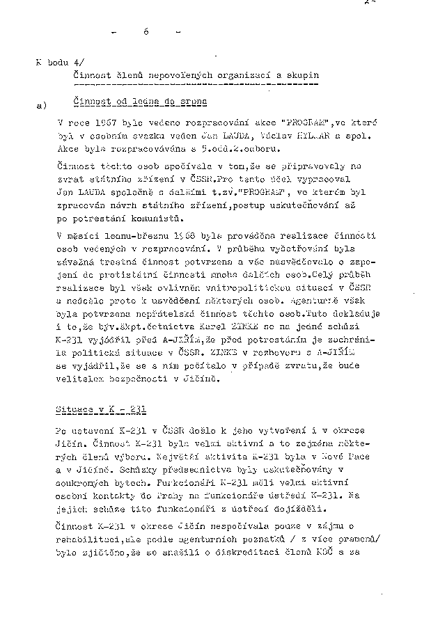 V roce 1967 bylo vedeno rozpracování akce "PROGRAM", ve které byl v osobním svazku veden Jan LAUDA, Václav HYLMAR a spol. Akce byla rozpracovávána s 5.odd. 2.odboru.