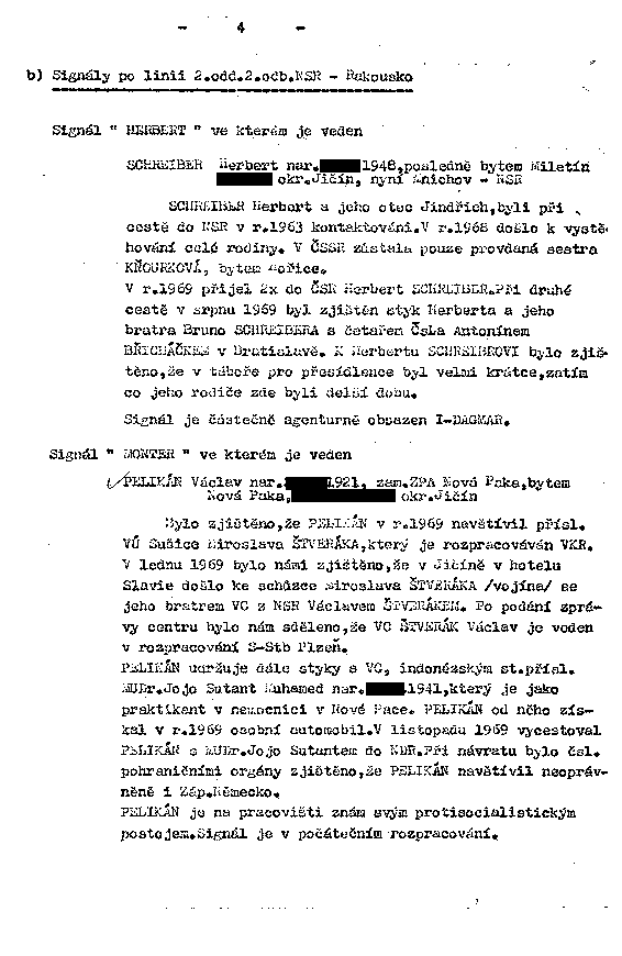 Bylo zjištěno, že PELIKÁN v r.1969 navštívil přísl. VÚ Sušice Miroslava ŠTVERÁKA, který je rozpracováván VKR. V lednu 1969 bylo námi zjištěno, že v Jičíně v hotelu Slavie došlo ke schůzce Miroslava ŠTVERÁKA /vojína/ se jeho bratrem VC z NSR Václavem ŠTVERÁKEM. Po podání zprávy centru bylo nám sděleno, že VC ŠTVERÁK Václav je veden v rozpracování S-Stb Plzeň.