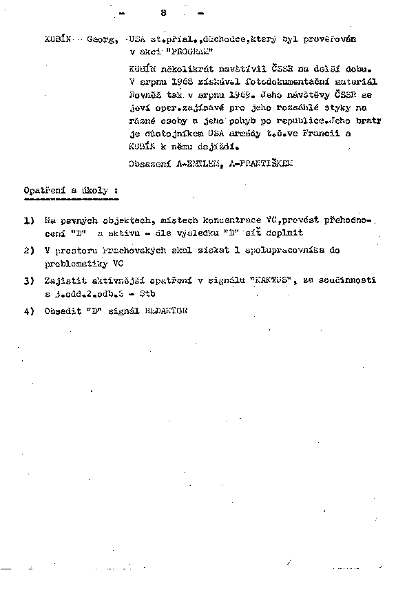 KUBÍN několikrát navštívil ČSSR na delší dobu. V srpnu 1968 získával fotodokumentační materiál. Rovněž tak v srpnu 1969. Jeho návštěvy ČSSR se jeví oper.zajímavé pro jeho rozsáhlé styky na různé osoby a jeho pohyb po republice. Jeho bratr je důstojníkem USA armády t.č.ve Francii a KUBÍN k němu dojíždí.
