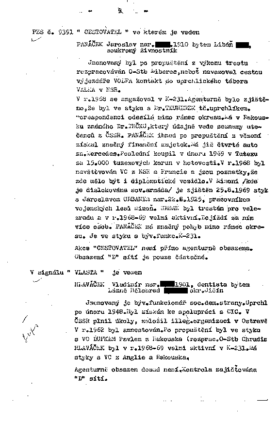 V r.1968 se angažoval v K-231. Agenturně bylo zjištěno, že byl ve styku s Dr.TEUNEREM tč. uprchlíkem. Korespondenci odesílal mimo rámec okresu. Má v Rakousku známého Dr.TRČKU, který údajně vede seznamy utečenců z ČSSR. PANÁČEK ihned po propuštění z vězení získal značný finanční majetek. Má již čtvrté auto zn.Mercedes. Poslední koupil v únoru 1969 v Tuzexu za 15.000 tuzexových korun v hotovosti. V r.1968 byl navštěvován VC z NSR a Francie a jsou poznatky, že zde mělo být i diplomatické vozidlo. V Mimoni /kde je dislokována sov.armáda/ je zjištěn 25.8.1969 styk s Jaroslavem URBANEM nar. XX.X.1925, pracovníkem vojenských lesů Mimoň. URBAN byl trestán pro velezradu a v r.1968-69 velmi aktivní. Dojíždí za ním více osob. PANÁČEK má značný pohyb mimo rámec okresu. Je ve styku s býv.funkc. K-231.