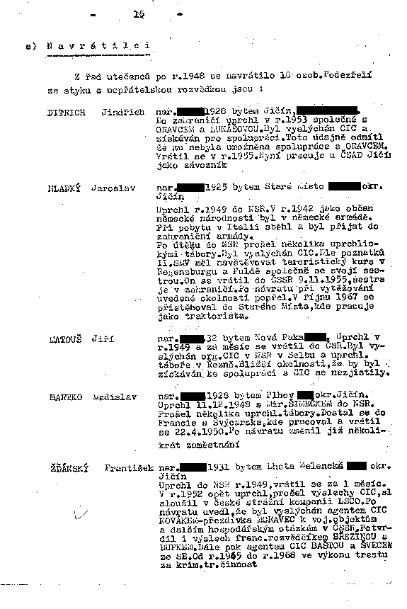 Z řad utečenců po r.1948 se navrátilo 10 osob. Podezřelí ze styku s nepřátelskou rozvědkou jsou :
