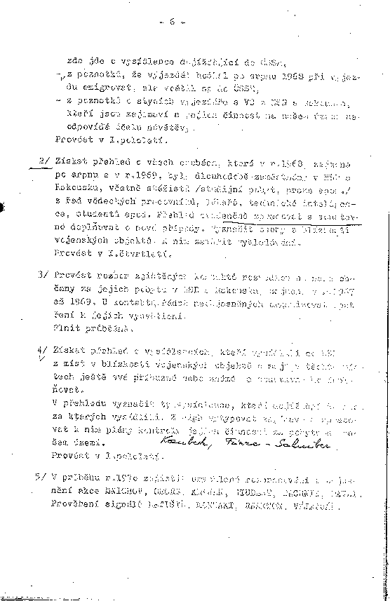 2/ Získat přehled o všech osobách, které v r. 1968, zejména po srpnu a v r. 1969, byly dlouhodobě zaměstnány v NSR a Rakousku, včetně stážistů /studijní pobyt, praxe apod./ z řad vědeckých pracovníků, lékařů, technické inteligence, studentů apod. Přehled evidenčně zpracovat a soustavně doplňovat o nové případy. Vyznačit osoby z blízkosti vojenských objektů. K nim zaměřit úkolování.