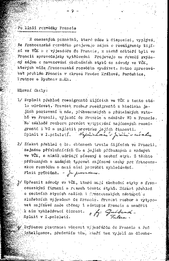 Z omezených poznatků, které máme k disposici, vyplývá, že francouzská rozvědka projevuje zájem o reemigranty žijící ve VČK a o výjezdáře do Francie, z nichž někteří byli ve Francii zpravodajsky vytěžování. Projevuje se rovněž zvýšený zájem o navazování obchodních styků se závody ve VČK, kterých může francouzská rozvědka využívat. Nutno zpracovávat problém Francie v okrese Hradec Králové, Pardubice, Trutnov a Rychnov n.Kn.
