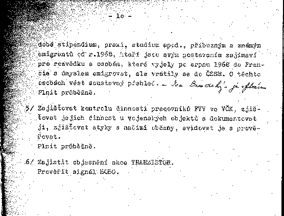 dobé stipendium, praxi, studium apod., příbuzným a známým emigrantů od r.1968, kteří jsou svým postavením zajímaví pro rozvědku a osobám, které vyjely po srpnu 1968 do Francie s úmyslem emigrovat, ale vrátily se do ČSSR. O těchto osobách vést soustavný přehled.