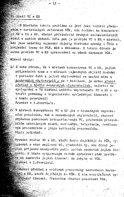 Z hlediska tohoto problému se jeví jako těžiště především v turistických oblastech VĆK, kde dochází ke koncentraci VC a CD z KS, včetně příslušníků druhých socialistických států a našich občanů. Dále pak je problém VC z KS v místech, kde jsou umístěny vojenské objekty Sovětské armády i ČSLA a průjezdní trasy do PLR, NDR a Rakouska. Z tohoto důvodu je nutno problém VC z KS zpracovávat ve všech okresech VČK.
