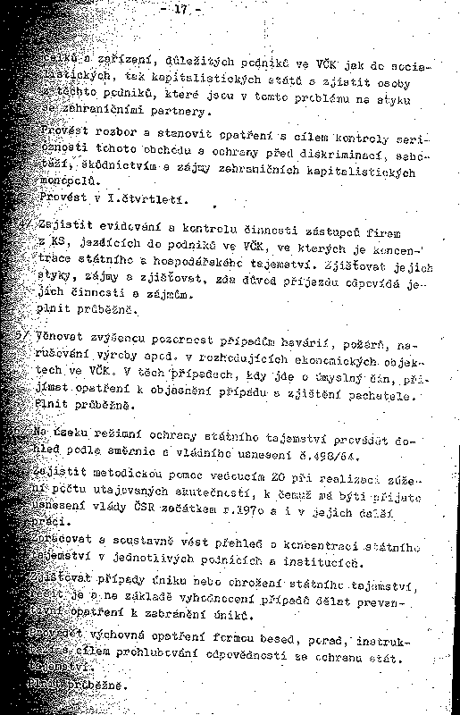 4/ Zajistit evidování a kontrolu činnosti zástupců firem z KS, jezdících do podniků ve VČK, ve kterých je koncentrace státního a hospodářského tajemství. Zjišťovat jejich styky, zájmy a zjišťovat, zda důvod příjezdu odpovídá jejich činnosti a zájmům.