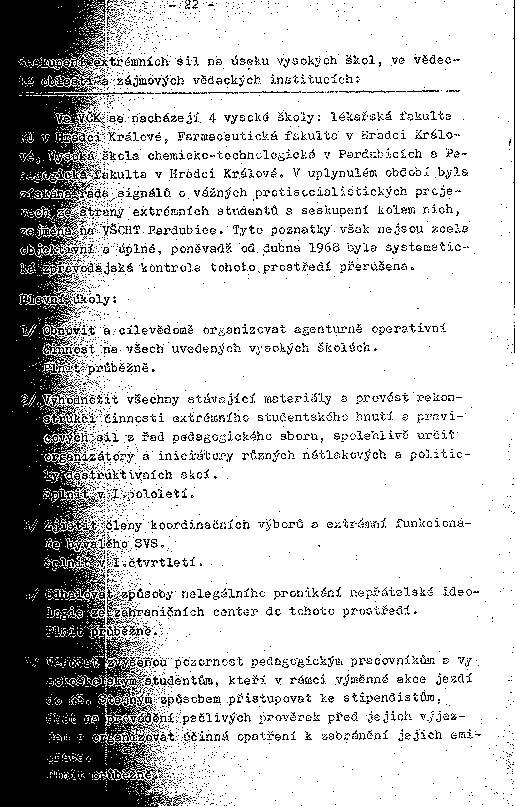 2/ Vyhodnotit všechny stávající materiály a provést rekonstrukci činnosti extrémního studentského hnutí a pravicových sil z řad pedagogického sboru, spolehlivě určit organizátory a iniciátory různých nátlakových a politicky destruktivních akcí.