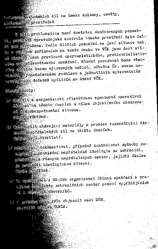 3/ Odhalovat, dokumentovat, případně kontrolovat způsoby nelegálního pronikání nepřátelské ideologie ze zahraničí, především z různých nepřátelských center, jejichž úkolem je provádět ideologickou diversi.