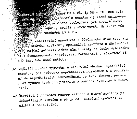 1/ Zhodnotit dosud používané KB a PB. Ty KB a PB, kde byla prováděna schůzková činnost s agenturou, která emigrovala nebo s ní byla skončena spolupráce pro neserióznost, nespolehlivost apod., zrušit a archivovat. Zajistit získávání nových vhodných KB a PB.