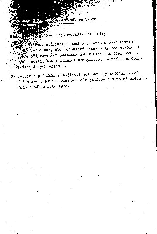 1/ Zkvalitňovat součinnost mezi 6.odborem a operativními úseky S-Stb tak, aby technické úkony byly nasazovány za dobře připravených podmínek jak z hlediska účelnosti a výslednosti, tak maximální konspirace, za přísného dodržování daných směrnic.