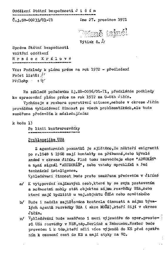 b/ Bude i nadále zajišťována kontrola činnosti a zájmu bývalých agentů rozvědky USA (akce MOŘE), kteří žijí v okrese Jičín.