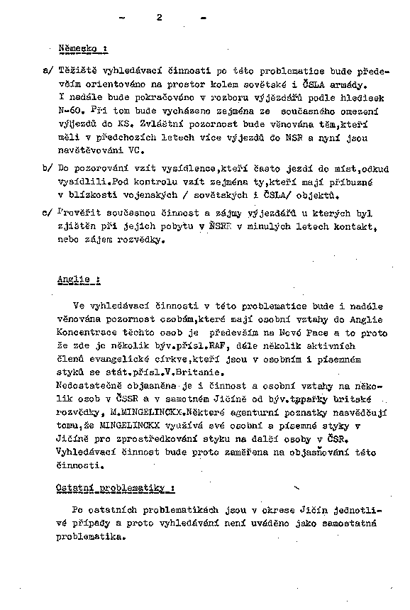 Nedostatečně objasněna je i činnost a osobní vztahy na několik osob v ČSSR a v samotném Jičíně od býv. typařky britské rozvědky, M.MINGELINCKX. Některé agenturní poznatky nasvědčují tomu, že MINGELINCKX využívá své osobní a písemné styky v Jičíně pro zprostředkování styku na další osoby v ČSR.